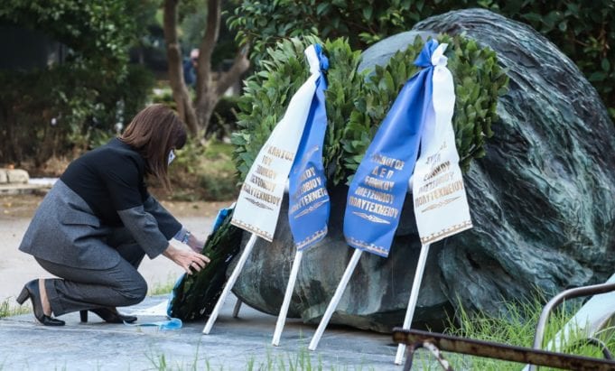 Χωρίς εκδηλώσεις και χωρίς την καθιερωμένη πορεία προς την αμερικάνικη πρεσβεία τιμάται η φετινή επέτειος για την ιστορική εξέγερση του Πολυτεχνείου για λόγους δημόσιας υγείας. Στεφάνι κατέθεσε στις 9 το πρωί η Πρόεδρος της Δημοκρατίας, η οποία δήλωσε ότι «η φετινή επέτειος γιορτάζεται σε πρωτόγνωρες συνθήκες, λόγω της πανδημίας. Το μήνυμα που εκπέμπει, όμως, σε αυτές τις κρίσιμες στιγμές, είναι καθολικό: η δημοκρατία δεν είναι μόνο καθεστώς ελευθερίας, αλλά και ευθύνης». Στις 10 το πρωί κατέθεσε στεφάνι στο Πολυτεχνείο και ο Πρωθυπουργός.
