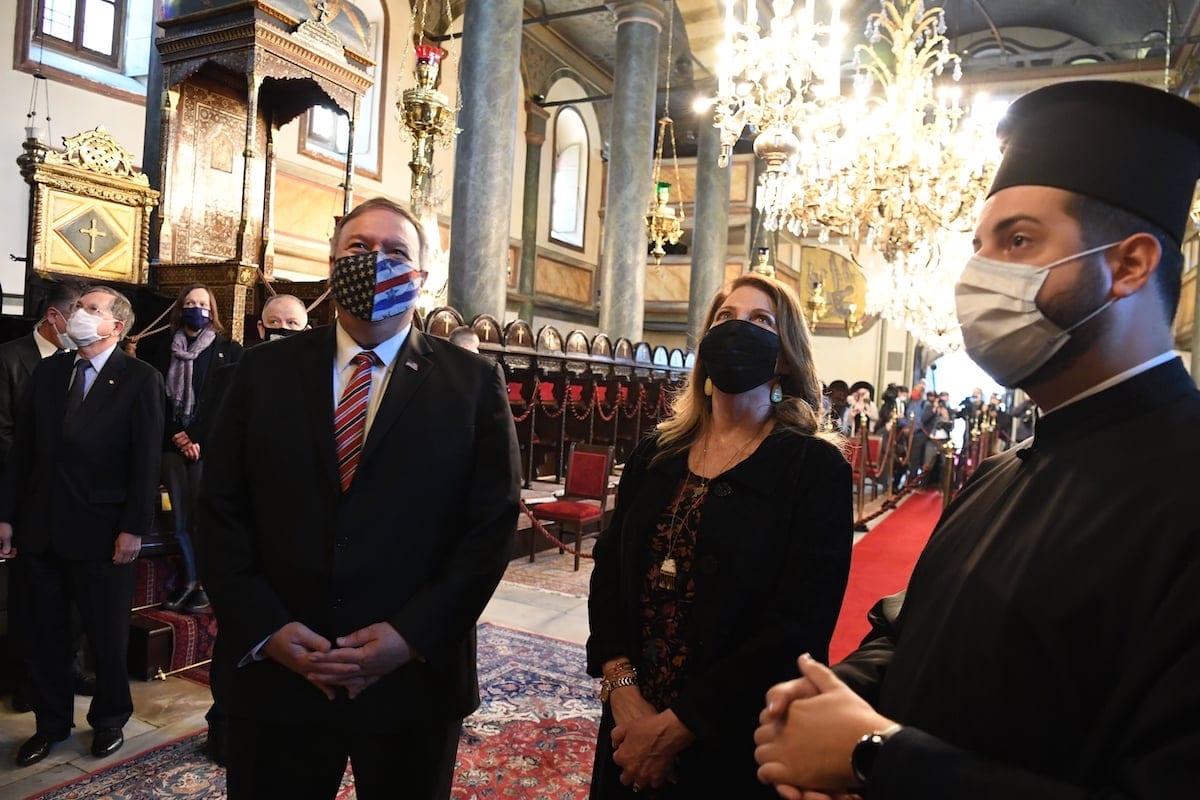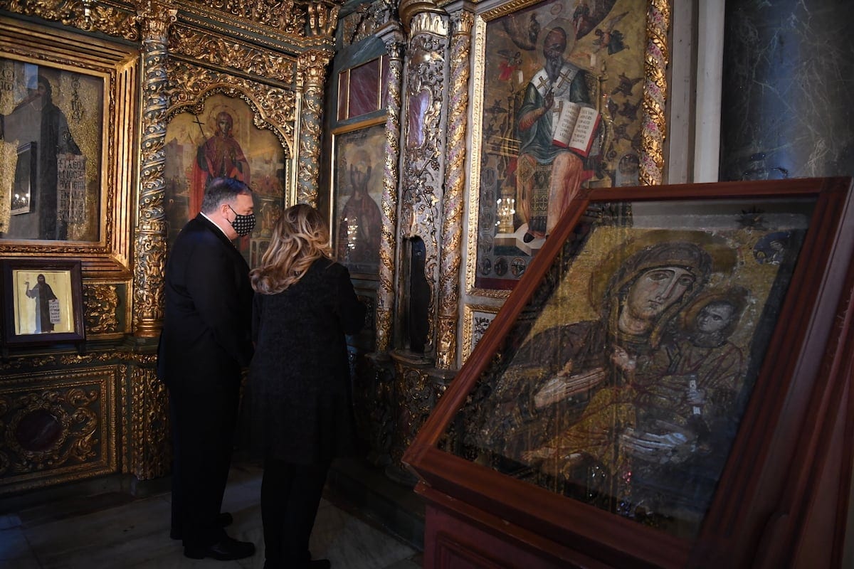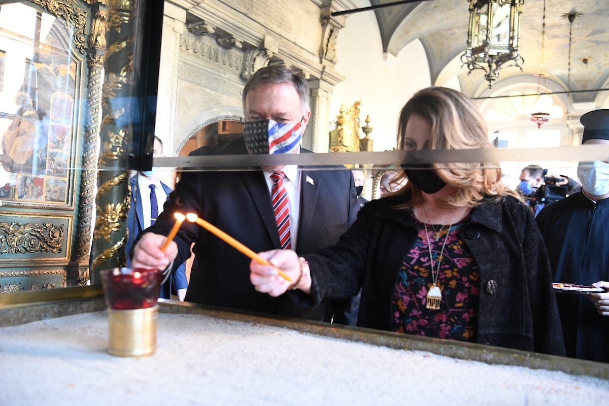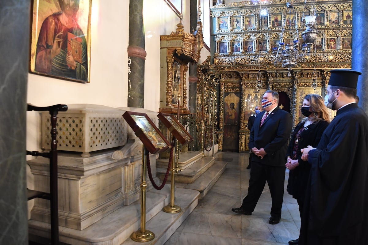 Ακολούθως, ο Πομπέο, η σύζυγός του και οι συνοδοί τους, προσκύνησαν στον Πατριαρχικό Ναό, όπου ο Πατριαρχικός διάκονος κ. Ιάκωβος Krochak τους ενημέρωσε για την ιστορία του, καθώς και για τα ιερά λείψανα και τα κειμήλια που φυλάσσονται σε αυτόν.