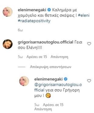 Αφορμή γι’ αυτό στάθηκαν οι δύο νέες φωτογραφίες και το αισιόδοξο μήνυμα που ανέβασε σήμερα στην προσωπική της σελίδα στο instagram. “Καλημέρα με χαμόγελο και θετικές σκέψεις” έγραψε η Ελένη και φυσικά μέσα σε λίγη ώρα δέχτηκε ατέλειωτα σχόλια και likes από τους followers της. Ανάμεσά τους και ο Γρηγόρης Αρναούτογλου ο οποίος βρήκε την ευκαιρία να επικοινωνήσει -έστω και έτσι- μαζί της.