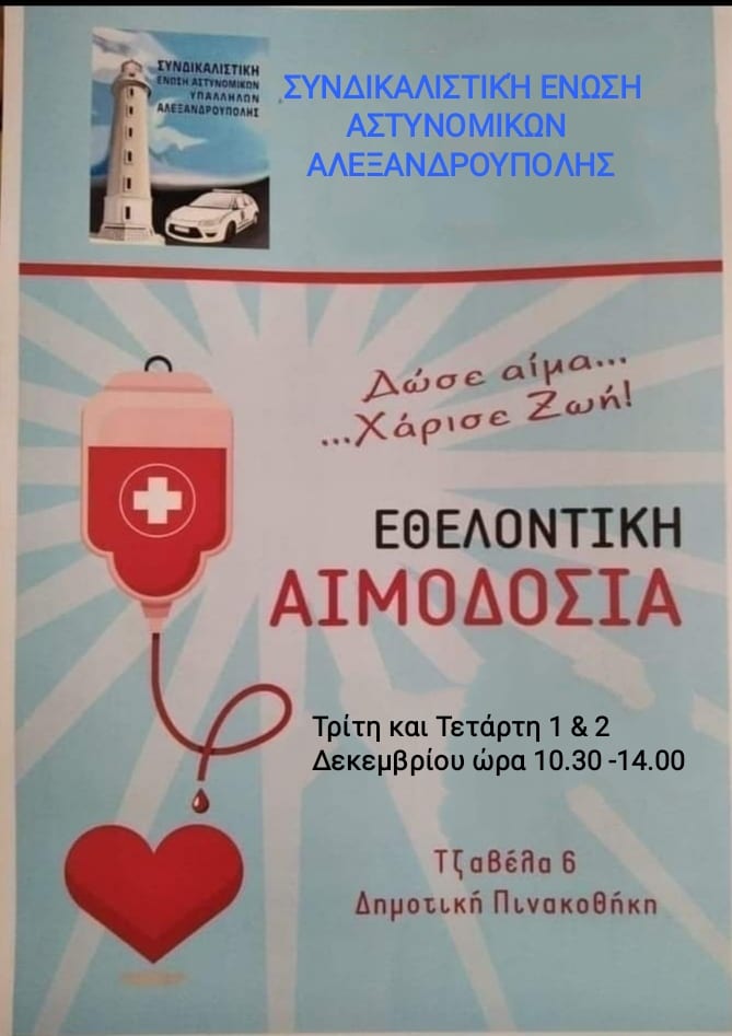 Η Συνδικαλιστική Ένωση Αστυνομικών Υπαλλήλων Αλεξανδρούπολης έπειτα από συνεννόηση με τον Διευθυντή της αιματολογικής κλινικής του Νοσοκομείου Αλεξανδρούπολης κ. Μαρτίνη Γεώργιο και τις μεγάλες ανάγκες σε αίμα, διοργανώνει εθελοντική αιμοδοσία την Τρίτη και την Τετάρτη 1 και 2 Δεκεμβρίου για την τράπεζα αίματος της Ελληνικής Αστυνομίας.