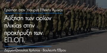 Να εξετάσει η πολιτική ηγεσία του υπουργείου Άμυνας το ενδεχόμενο αύξησης των ηλικιακών ορίων από τα 28 στα 32 έτη στην προκήρυξη του διαγωνισμού πρόσληψης για τους επαγγελματίες οπλίτες ζητά με ερώτησή του προς τον υπουργό Νικόλαο Παναγιωτόπουλο ο βουλευτής Έβρου, Χρήστος Δερμεντζόπουλος.