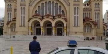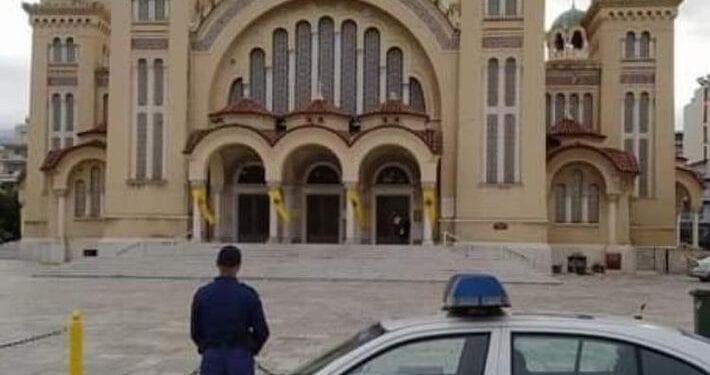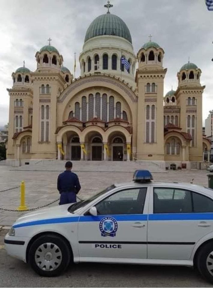 Μια εικόνα που δεν μας τιμά. Περιπολικά φυλάνε τον μεγαλοπρεπή ναό του Αγίου Ανδρέα στην Αχαϊκή πρωτεύουσα, για να μην πλησιάσουν οι πιστοί, ούτε εξ αποσπάσεως.