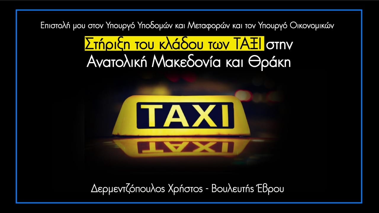 Έπειτα από συνεχή επικοινωνία με τους προέδρους των σωματείων των ΤΑΞΙ στο νομό Έβρου καθώς και στην ευρύτερη περιοχή της Π.Α.Μ.-Θ, εύκολα μπορεί να διαπιστώσει κανείς το τεράστιο πλήγμα που έχει υποστεί από την πανδημία του COVID-19 ο συγκεκριμένος κλάδος. Καθημερινά, οι ιδιοκτήτες και οι οδηγοί των ΤΑΞΙ βλέπουν τα έσοδα τους να συρρικνώνονται, ενώ ταυτόχρονα τα πάγια έξοδα και οι υποχρεώσεις τους αυξάνονται (κόστος καθαριότητας/απολύμανσης οχημάτων ως μέτρα προφύλαξης οδηγών και επιβατών κατά του κορωνοϊού). Συνεπώς, σας παραθέτω να εξετάσετε την επιστολή τους, μέσα από την οποία διατυπώνονται χρόνια, επίκαιρα και δίκαια αιτήματα του συγκεκριμένου κλάδου των περιοχών όλης της περιφέρειας Ανατολικής Μακεδονίας και Θράκης.