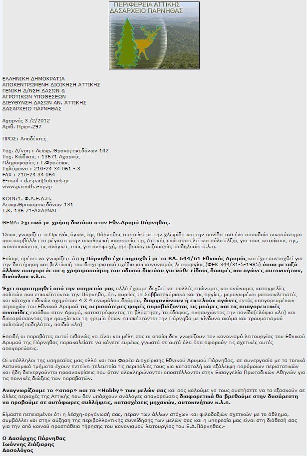 Σύμφωνα με Δελτίο Τύπου του Φορέα Διαχείρισης Εθνικού Δρυμού Πάρνηθας στις 3/2/2012, απαγορεύεται η χρησιμοποίηση του οδικού δικτύου για κάθε είδους δοκιμές και αγώνες αυτοκινήτων, δικύκλων κλπ.