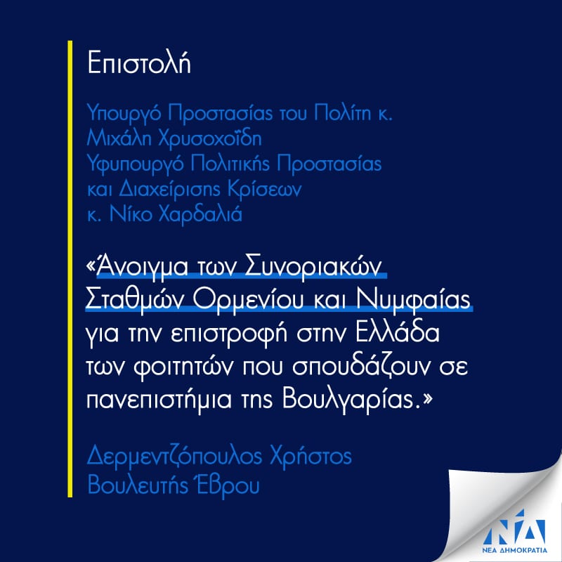 Εξαιτίας της μεγάλης έξαρσης της πανδημίας στις γειτονικές Βαλκανικές χώρες και με γνώμονα την προστασία της δημόσιας υγείας, η κυβέρνηση προχώρησε έγκαιρα στην απαγόρευση διέλευσης πολιτών από τους συνοριακούς σταθμούς Ορμενίου και Νυμφαίας. Η παραπάνω απόφαση ωστόσο δημιουργεί σήμερα σημαντικά προβλήματα στους πολυάριθμους φοιτητές με καταγωγή από τον Έβρο, που σπουδάζουν στη Βουλγαρία και επιθυμούν να επιστρέψουν ενόψει των εορτών στην Ελλάδα.