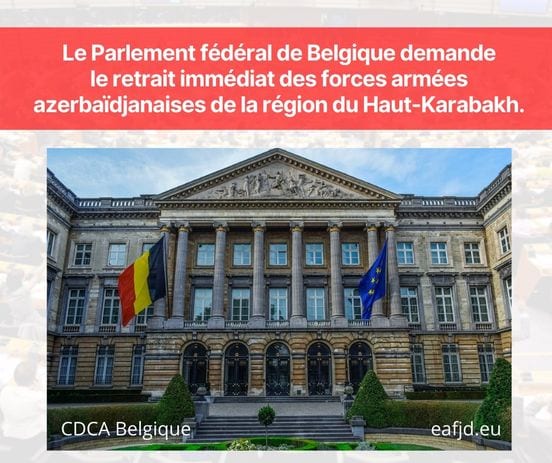 Μετά τη Γαλλική Γερουσία και το κοινοβούλιο των Κάτω Χωρών, το Βέλγιο της Βουλής εξέδωσε ψήφισμα που καταδικάζει τη στρατιωτική επίθεση του Αζερμπαϊτζάν, υποστηριζόμενη από τις τουρκικές αρχές και τους ξένους μισθοφόρους, εναντίον των αρμενικών πληθυσμών της Δημοκρατίας του Artsakh, επίσης ως εσκεμμένες επιθέσεις του Αζερμπαϊτζάν εναντίον αμάχων και χρήση πυρομαχικών διασποράς και βόμβων φωσφόρου, αναφέρει η Ευρωπαϊκή Αρμενική Ομοσπονδία Δικαιοσύνης και Δημοκρατίας (EAFJD).