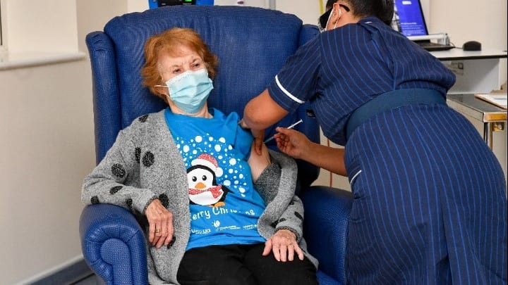 Η Μάργκαρετ Κίναν, μια 90χρονη γιαγιά από τη Βρετανία, έγινε ο πρώτος άνθρωπος στον κόσμο που έκανε το εμβόλιο της Pfizer κατά της Covid-19 εκτός του πλαισίου των δοκιμών, μετά την κλινική έγκρισή του.