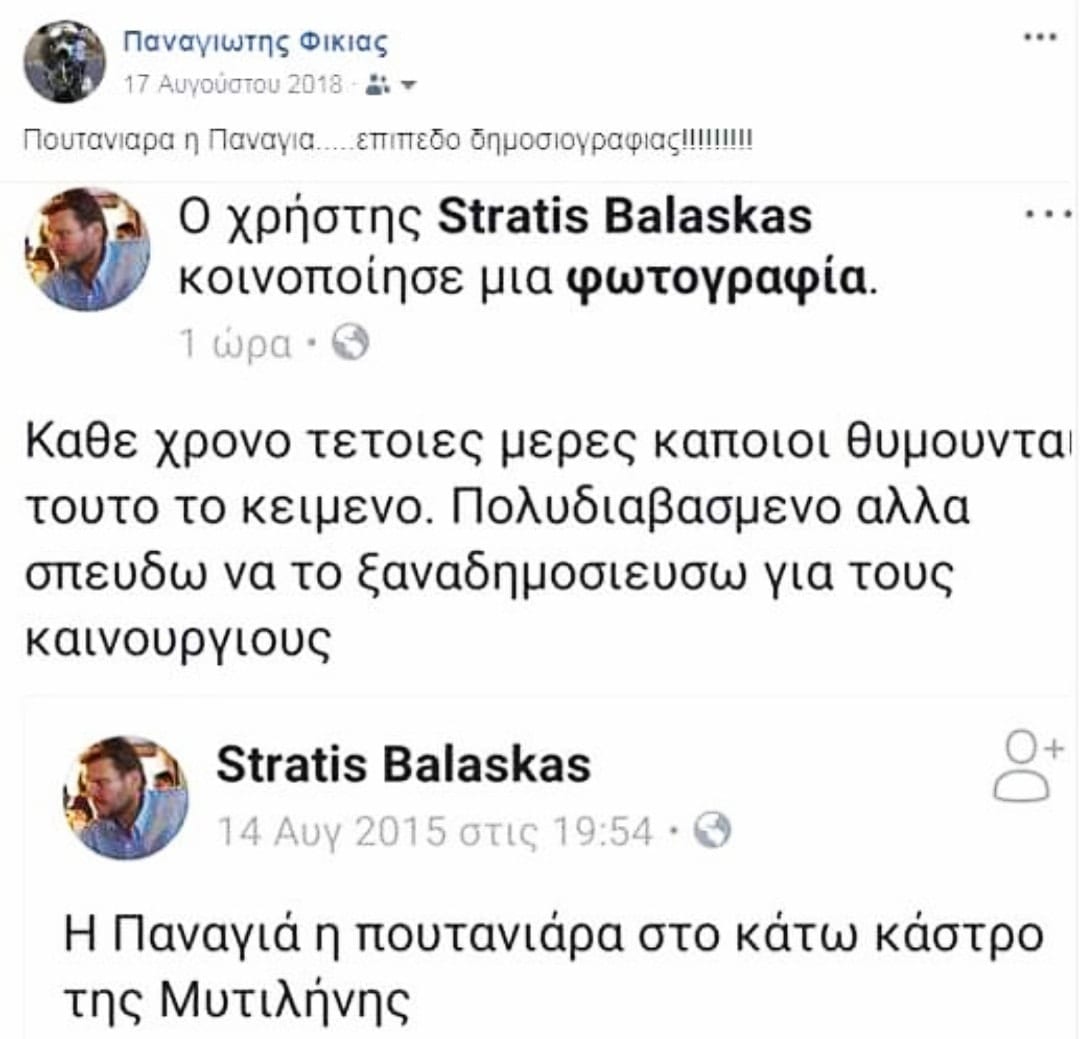 Δείτε το επίμαχο προσβλητικό δημοσίευμα του «δημοσιογράφου» Μπαλάσκα κατά της Παναγίας και το σχόλιο του αστυνομικού Φίκια και βγάλτε τα συμπεράσματα σας! Βέβαια ο ΣΥΡΙΖΑ Λέσβου και τοπικοί συνδικαλιστικοί φορείς που βγάζουν ανακοινώσεις συμπαράστασης στον δημοσιογράφο, υιοθετούν και τα δημόσια σχόλια του, που εξυβρίζουν τα Θεία.
