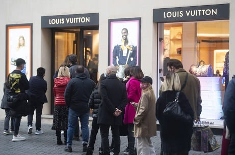 Ουρές έξω από τον διάσημο οίκο LOUIS VUITTON, με τους αγοραστές να περιμένουν την σειρά τους για να αποκτήσουν μια δημιουργία του πανάκριβου οίκου μόδας.