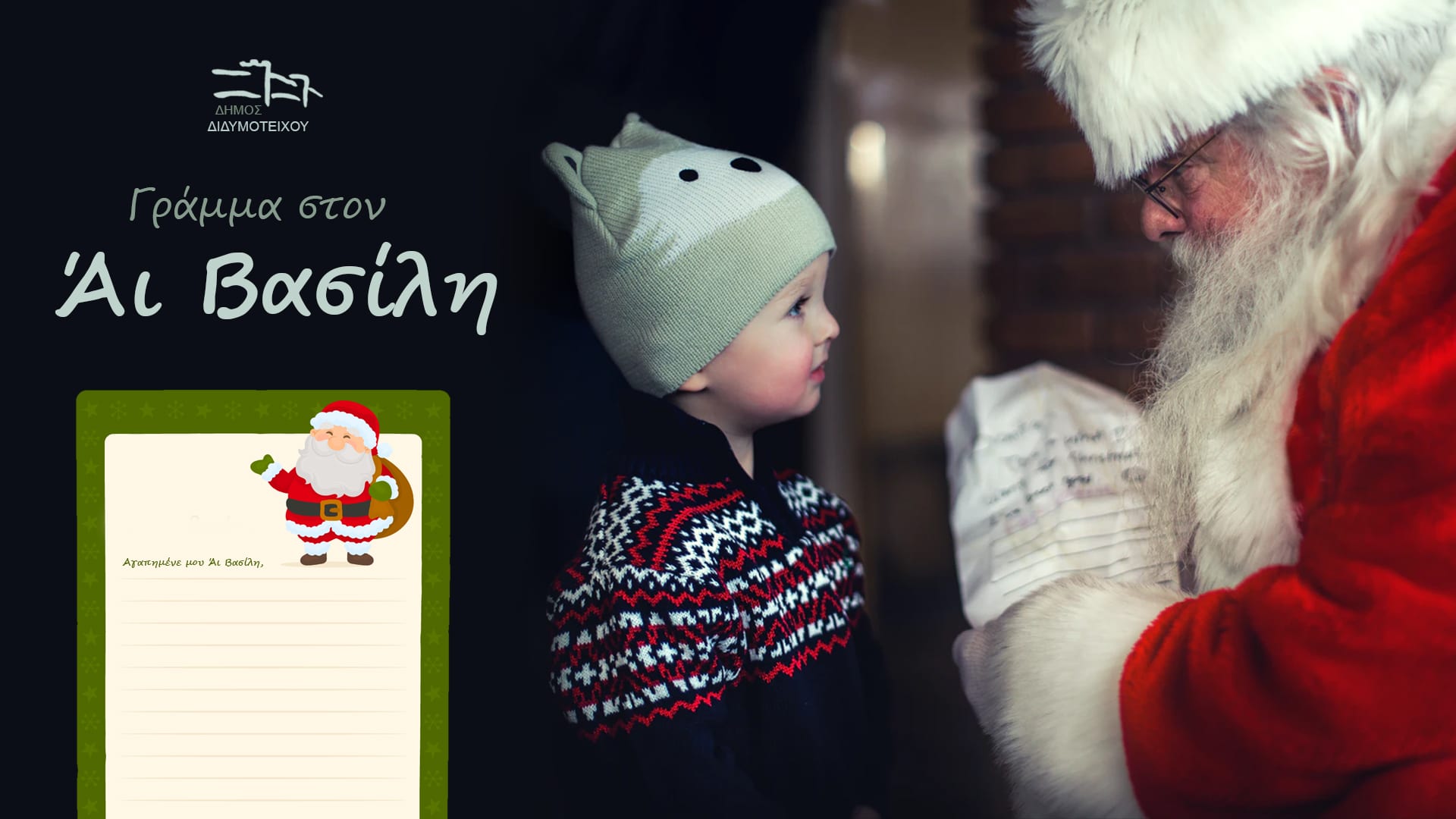 Από την Δευτέρα 21 εώς και την Τρίτη 29 Δεκεμβρίου, οι δημότες Διδυμοτείχου θα έχουν τη δυνατότητα να παραδώσουν τα χριστουγεννιάτικα δώρα στον Δήμο Διδυμοτείχου, ώστε να τα παραδώσει ο Άι Βασίλης με το έλκηθρο του στην διεύθυνση που θα δηλώσουν. Τη δράση «Γράμμα στον Άι Βασίλη» συντονίζουν ο Δήμος Διδυμοτείχου και το «Ευγενίδειο» κέντρο Πολιτισμού, Αθλητισμού, Παιδείας, Νεολαίας και Περιβάλλοντος.