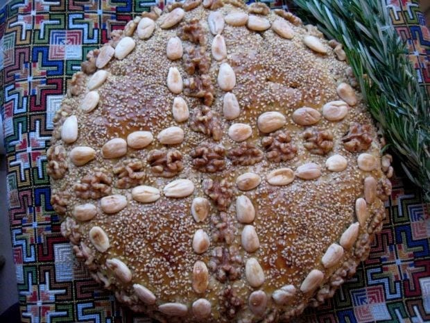 Αφού το στολίσουν με περίτεχνα σχέδια από το ίδιο ζυμάρι και αφού το εμπλουτίσουν με κάποιο χρυσό ή ασημένιο νόμισμα, που το αποκαλούν «ηύρεμα», το ψήνουν σε ξυλόφουρνο και το διατηρούν ζεστό μέχρι τη βραδινή οικογενειακή σύναξη.
