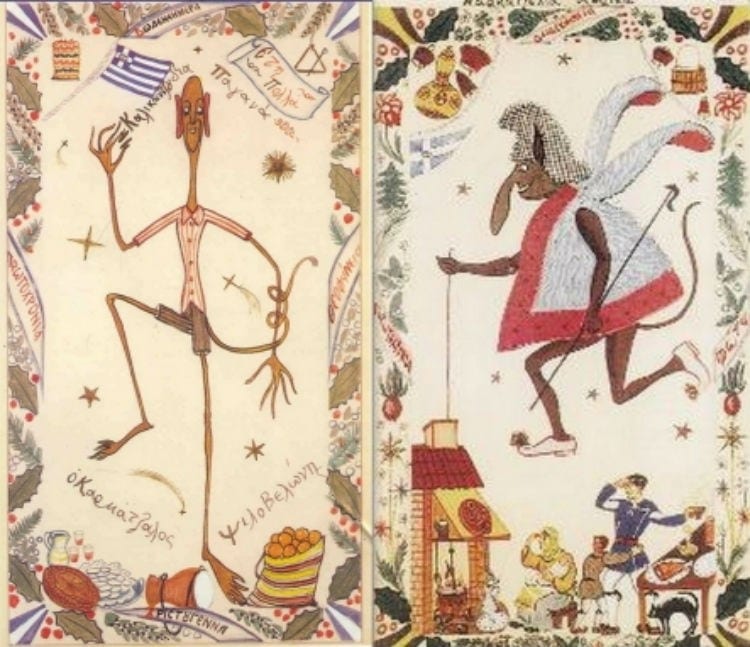 Η λαϊκή φαντασία οργιάζει με τις σκανταλιές των καλικάντζαρων, που βρίσκουν την ευκαιρία να αλωνίσουν στον επάνω κόσμο τότε που τα νερά είναι «αβάφτιστα». Η όψη τους είναι τρομακτική, ενώ οι σκανταλιές τους απερίγραπτες. Το μόνο που τους τρομάζει είναι η φωτιά.