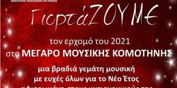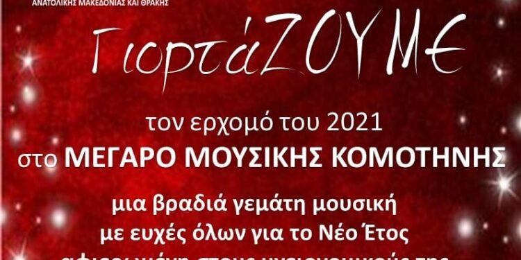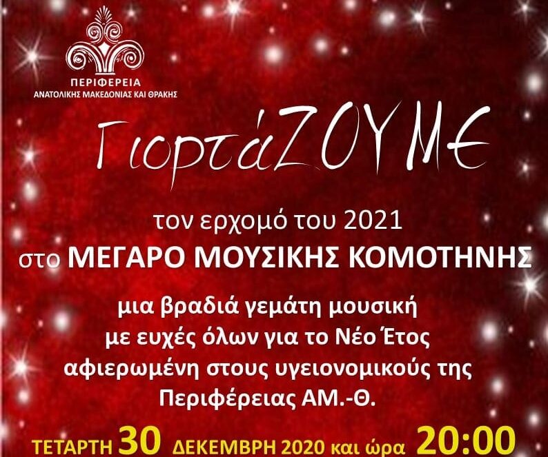 Γιορτάζουμε τον ερχομό του 2021 και σας προσκαλούμε σε μια βραδιά γεμάτη μουσική και ευχές την Τετάρτη 30 Δεκεμβρίου 2020 στις 20:00 στο Μέγαρο Μουσικής Κομοτηνής αφιερωμένη σε όλους τους υγειονομικούς της Περιφέρειας ΑΜΘ.