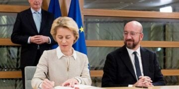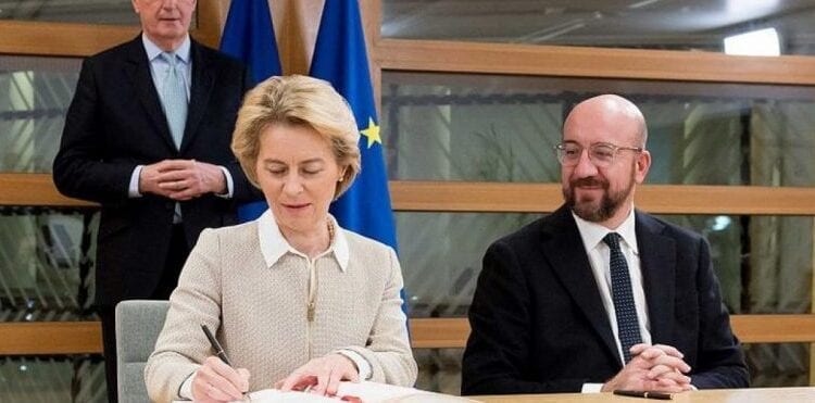 Η πρόεδρος της Ευρωπαϊκής Επιτροπής Ούρσουλα φον ντερ Λάιεν και ο πρόεδρος του Συμβουλίου Σαρλ Μισέλ θα υπογράψουν σήμερα την εμπορική συμφωνία στην οποία κατέληξαν με το Λονδίνο, όπως ανακοίνωσε χθες μια εκπρόσωπος της Κομισιόν. Η συμφωνία αναμένεται επίσης ότι θα υπογραφεί στο Λονδίνο από τον πρωθυπουργό της Βρετανίας Μπόρις Τζόνσον.