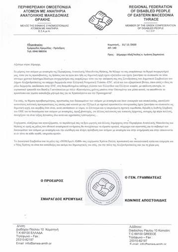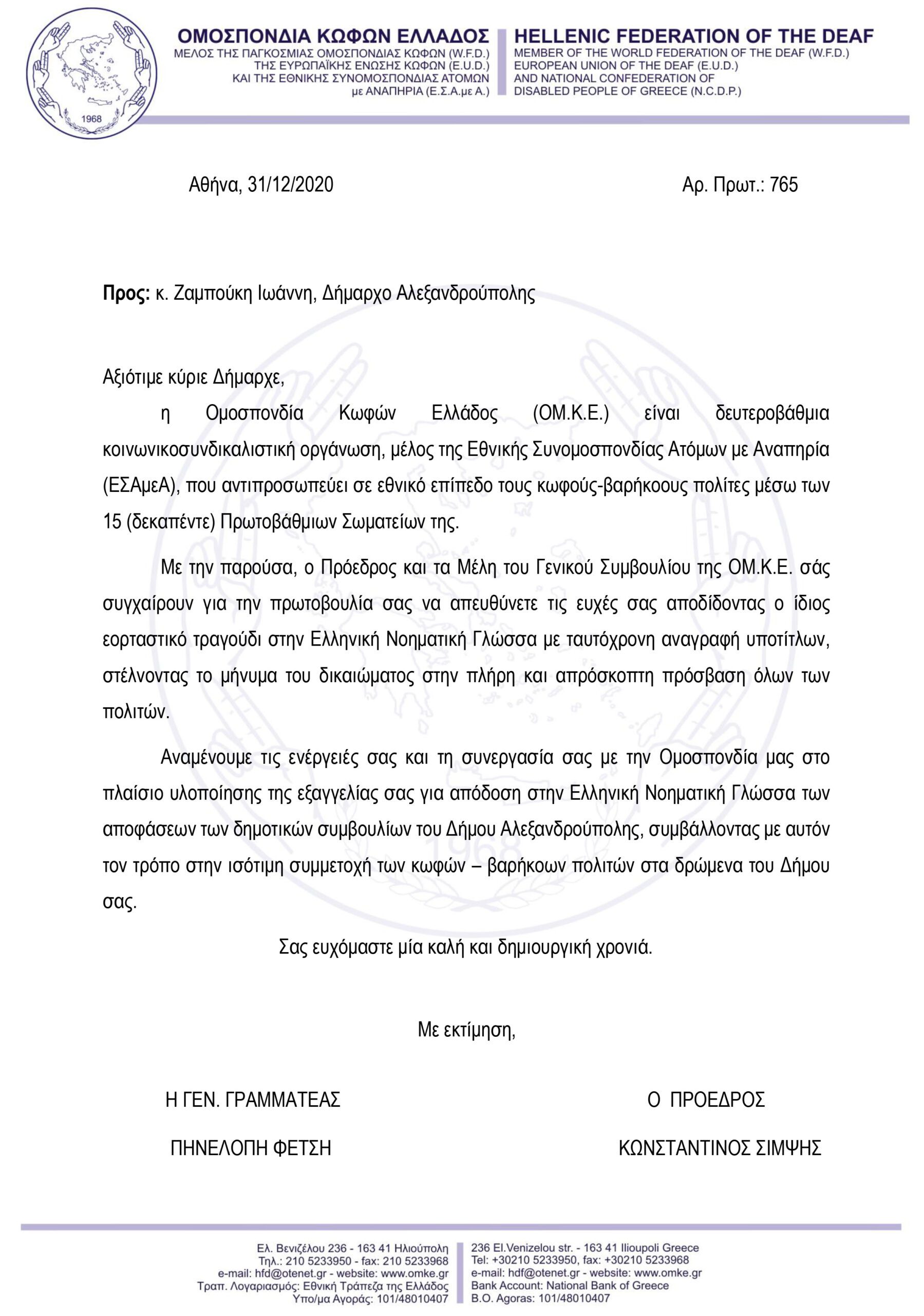 Με επιστολή τους προς τον Δήμαρχο Αλεξανδρούπολης Γιάννη Ζαμπούκη, η Ομοσπονδία Κωφών Ελλάδος και την Περιφερειακή Ομοσπονδία ΑμεΑ Ανατ. Μακεδονίας – Θράκης εκφράζουν τα θερμά τους συγχαρητήρια για την πρωτοβουλία του να απευθύνει τις εορταστικές του ευχές στην Νοηματική γλώσσα καθώς και για την απόφασή του από τη νέα χρονιά να αποδίδονται οι αποφάσεις του Δημοτικού Συμβουλίου και στη Νοηματική γλώσσα.