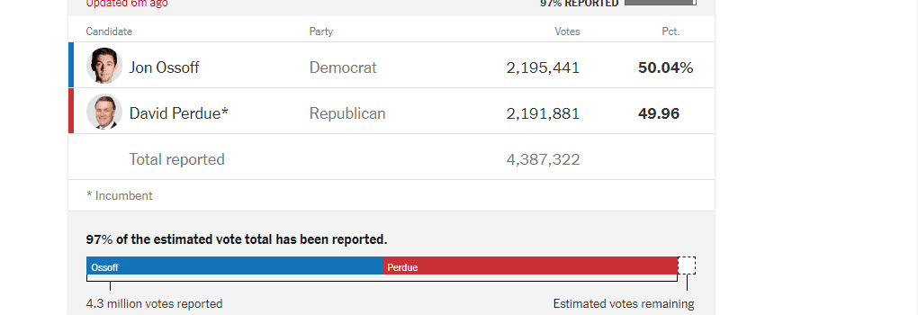 Ο 38 χρονος Δημοκρατικός Jon Ossoff κερδίζει οριακά με 50,04% τον Ρεπουμπλικανό David Perdue που συγκεντρώνει 49,96%.