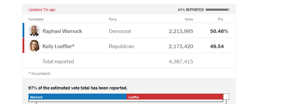 Ο Δημοκρατικός Raphael Wornock έχει ποιο σαφές προβάδισμα με 50,46% έναντι 49,54% της αντιπάλου του Kelly Loeffler και η έδρα αναμένεται να καταλήξει στο στρατόπεδο Μπάιντεν.