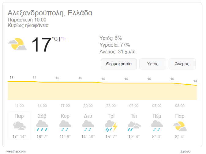 - Θερμοκρασία: Από 08 έως 18 βαθμούς Κελσίου. Στη δυτική Μακεδονία 4 με 5 βαθμούς χαμηλότερη.