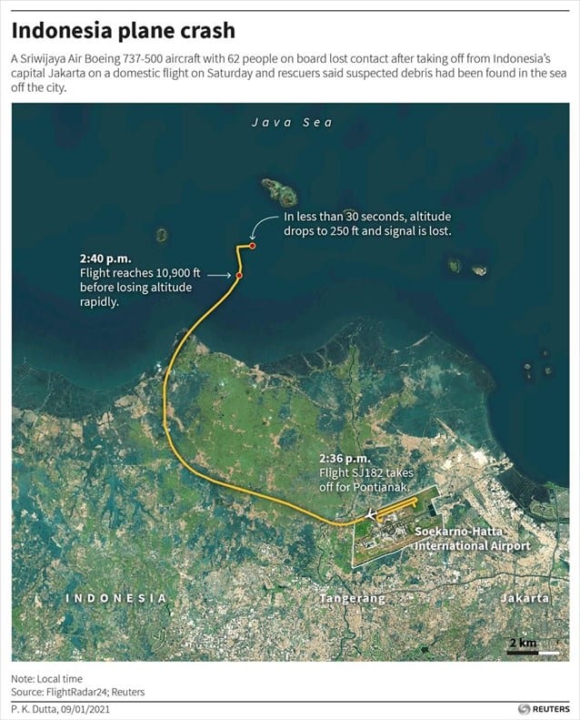 Το αεροσκάφος της Sriwijawa εκτελούσε δρομολόγιο που συνδέει την Τζακάρτα με την Ποντιάνακ, στο ινδονησιακό τμήμα του νησιού Βόρνεο, όταν η επαφή του με τους ελεγκτές εναέριας κυκλοφορίας χάθηκε χθες Σάββατο λίγο μετά τις 14:40 (τοπική ώρα· 09:40 ώρα Ελλάδας), περίπου 4 λεπτά μετά την απογείωση.