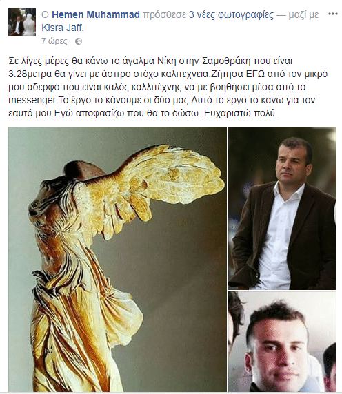 Αυτή τη φορά ξεκινά σε λίγες μέρες κάτι το μεγαλοπρεπές, την Νίκη της Σαμοθράκης 3,28 μέτρων και όπως αναφέρει στο προσωπικό του προφίλ, θα είναι ένα έργο που το κάνει για τον εαυτό του και θα διαλέξει ο ίδιος που και αν θα το χαρίσει.
