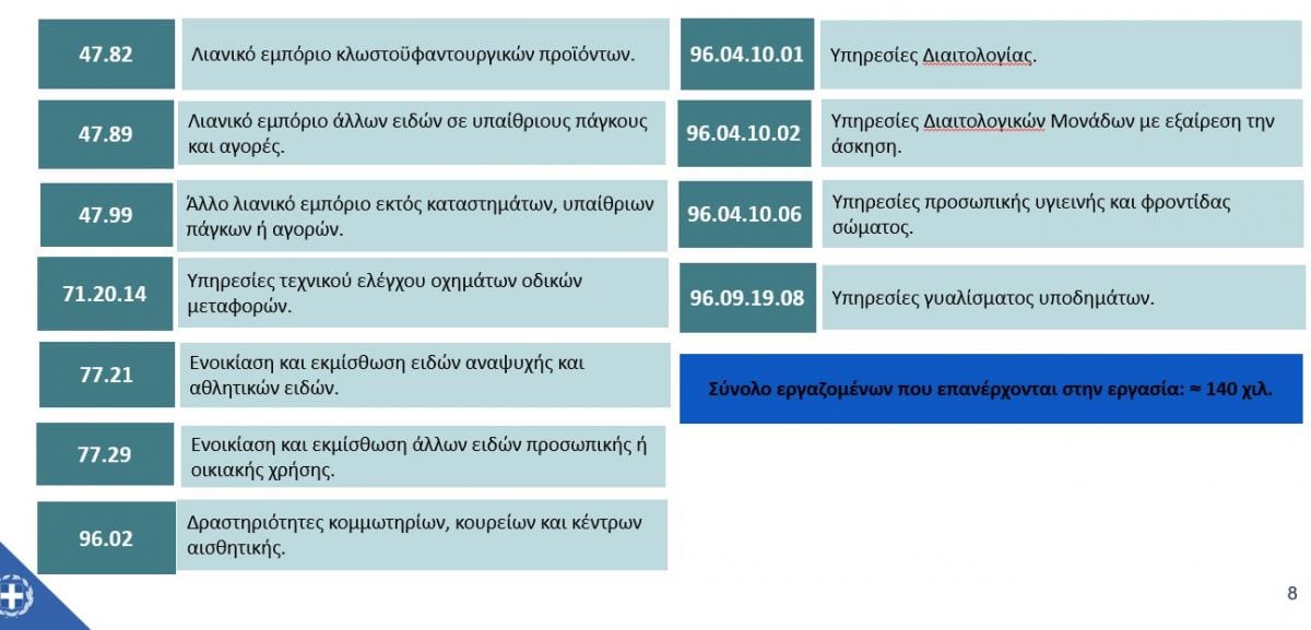 -Για τις υπηρεσίες πλην των κομμωτηρίων, κουρείων και διαιτολογίας, απαιτείται η ανάπτυξη διαχωριστικού πετάσματος τύπου plexiglass. Ο πληθυσμός των πελατών είναι ενιαίος, ανεξαρτήτως επιπέδων ορόφων και δεν συμπεριλαμβάνει τους εργαζόμενους.