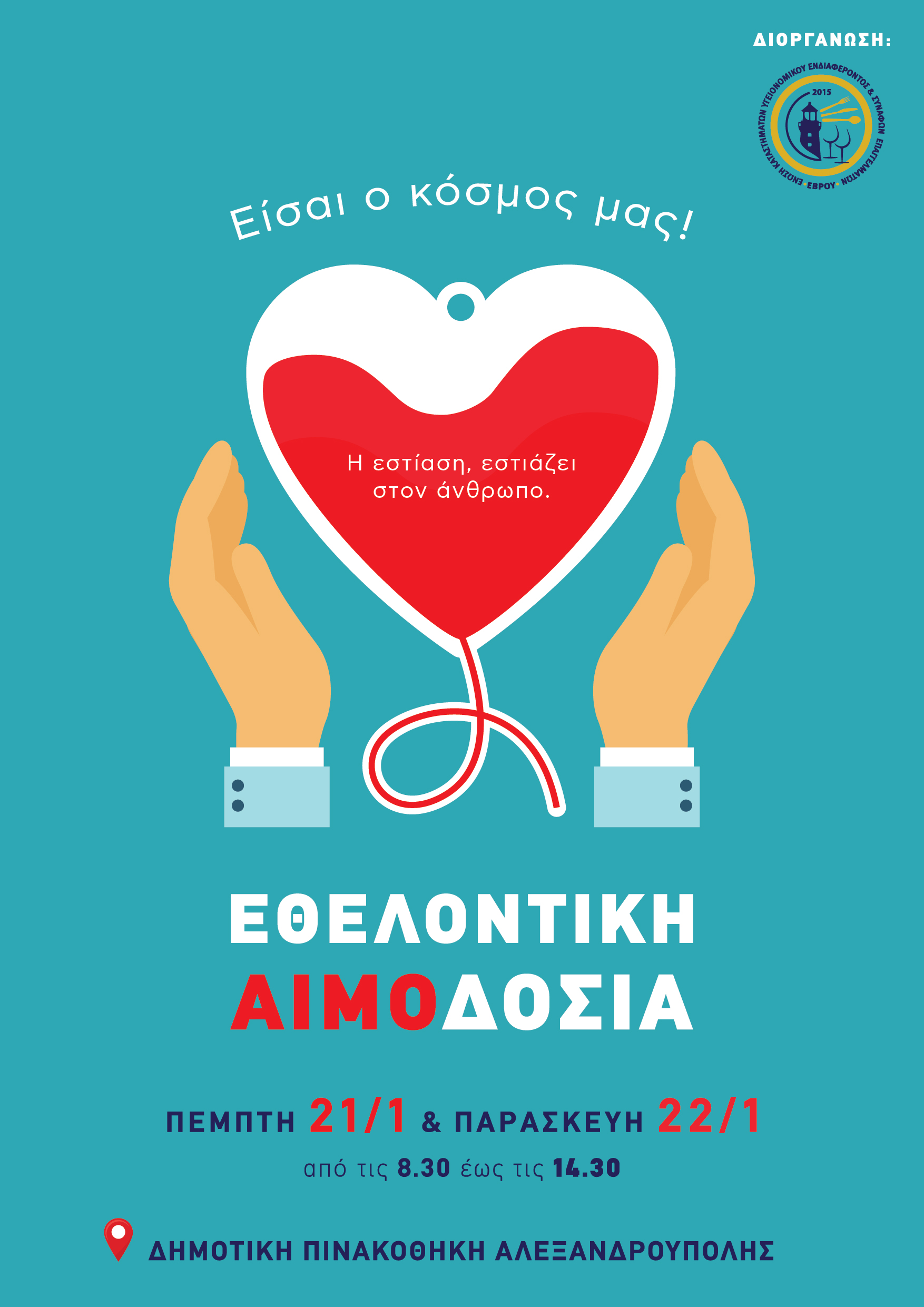 Ευχαριστούμε το Τμήμα Αιμοδοσίας του Γενικού Πανεπιστημιακού Νοσοκομείου Αλεξανδρούπολης, τον Διοικητή του Νοσοκομείου κ. Βαγγέλη Ρούφο αλλά και τον Δήμο Αλεξανδρούπολης για την παραχώρηση του χώρου της Δημοτικής Πινακοθήκης.