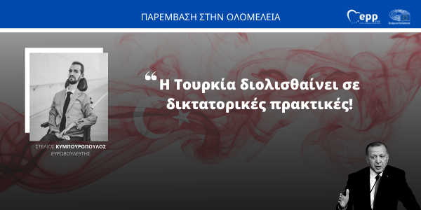 Με αφορμή τη συζήτηση στην Ολομέλεια του Ευρωπαϊκού Κοινοβουλίου σχετικά με την πρόταση ψηφίσματος για την κατάσταση των ανθρωπίνων δικαιωμάτων στην Τουρκία, με έμφαση στην περίπτωση του Σελαχατιν Ντεμιρτάς και άλλων κρατουμένων συνείδησης, ο Ευρωβουλευτής της Νέας Δημοκρατίας και του Ε.Λ.Κ., κ. Κυμπουρόπουλος προέβη σε δριμείς δηλώσεις για την συνεχιζόμενη αλλοίωση του κράτους δικαίου και την υπονόμευση του δημοκρατικού καθεστώτος στην Τουρκία. Αναφερόμενος στην έλλειψη της διάκρισης εξουσιών στην γείτονα χώρα, ο Ευρωβουλευτής υπογραμμίζει τους υψηλούς αριθμούς Τούρκων πολιτών που στερούνται όχι μόνο των δικαιωμάτων όσο και της ελευθερίας τους.