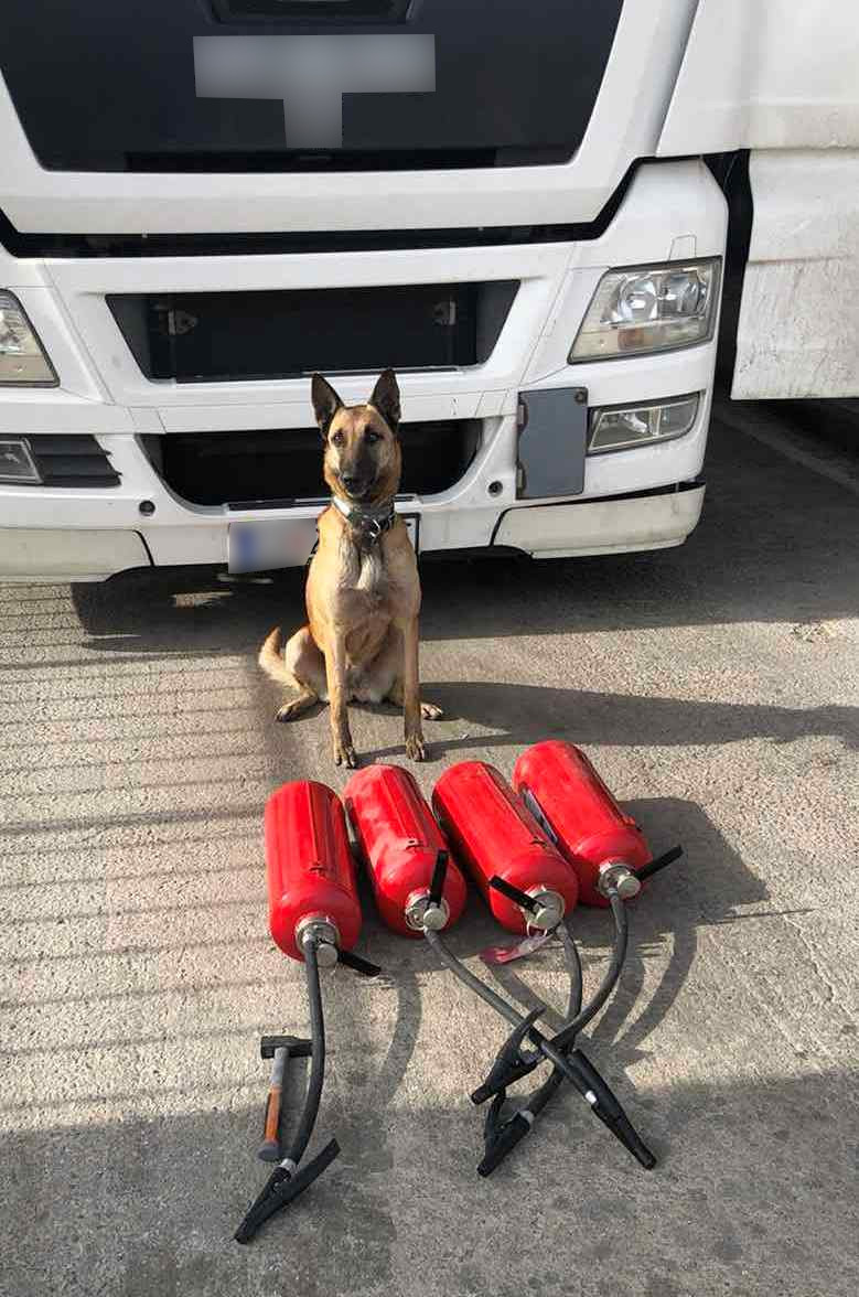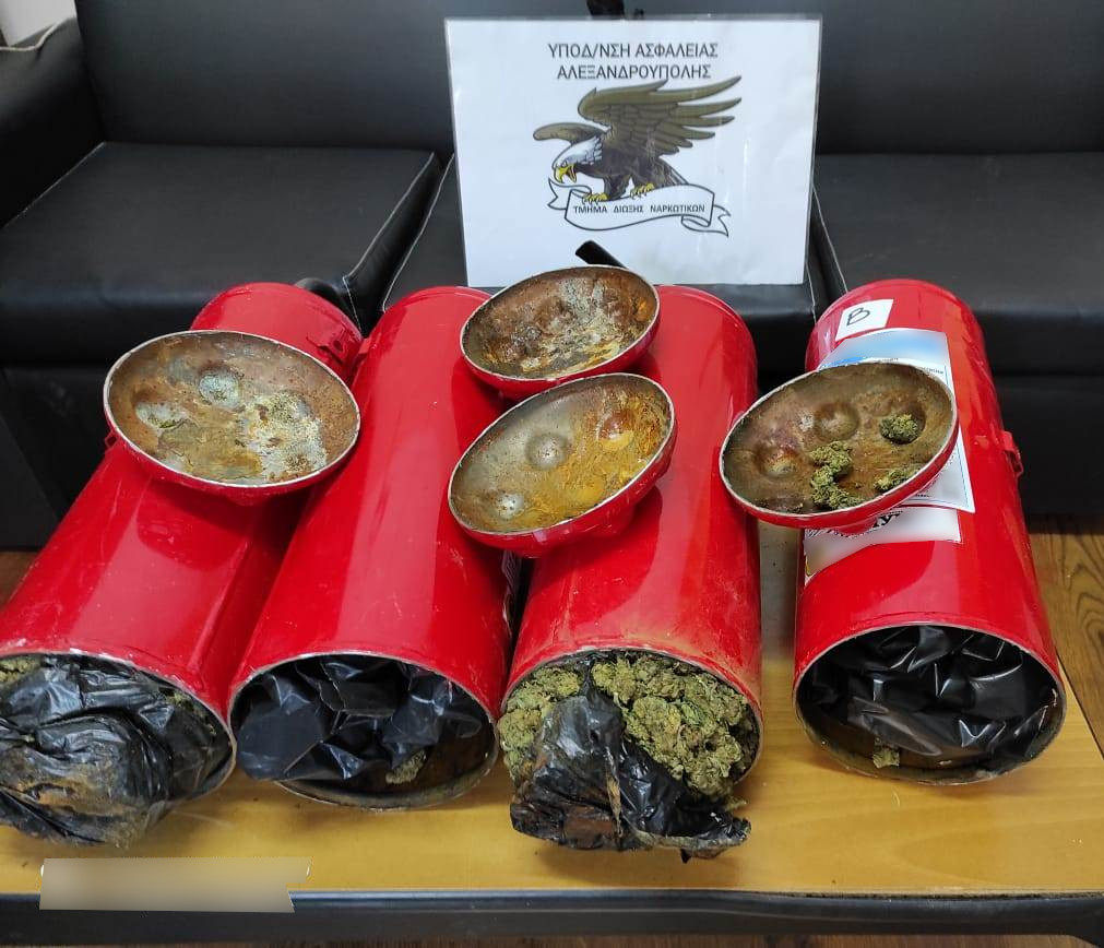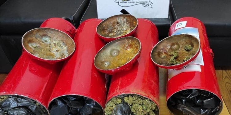 Συγκεκριμένα, κατά την έρευνα που διενεργήθηκε με τη συνδρομή του αστυνομικού σκύλου ανίχνευσης ναρκωτικών “Laika”, βρέθηκαν σε βοηθητικούς αποθηκευτικούς χώρους του τράκτορα, τέσσερις πυροσβεστήρες οι οποίοι περιείχαν στο εσωτερικό τους τέσσερις νάιλον συσκευασίες με ακατέργαστη κάνναβη, συνολικού βάρους 8.210 γραμμαρίων.