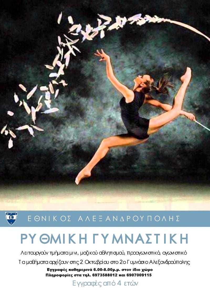 Στις 2 Οκτωβρίου ξεκινούν οι προπονήσεις για τα τμήματα της Ρυθμικής Γυμναστικής του ΕΘΝΙΚΟΎ, σε νέο χώρο, στο γυμναστήριο του 2ου Γυμνασίου Αλεξανδρούπολης.