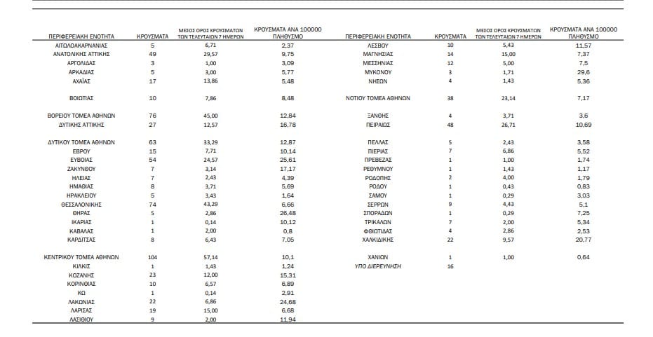 Στο κόκκινο η Αττική, όπου καταγράφηκαν 409 κρούσματα με τον Κεντρικό (104)και τον Βόρειο(76) Τομέα να έχουν την μεγαλύτερη επιβάρυνση για μια ακόμη ημέρα. Ακολουθούν η Θεσσαλονίκη με 74 κρούσματα και η Εύβοια με 54.