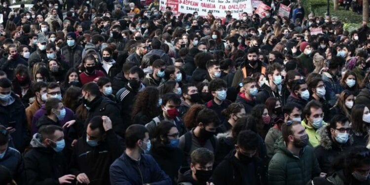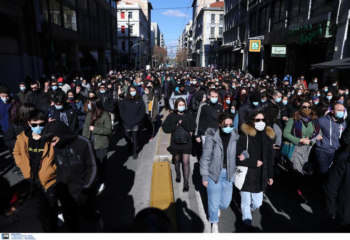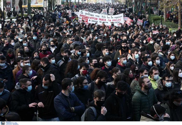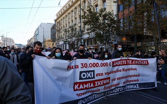 Παρά την απαγόρευση συναθροίσεων άνω των 100 ατόμων μεγάλος όγκος από διαδηλωτές, μαθητές, φοιτητές, ΟΛΜΕ, ΔΟΕ, ΟΔΠΤΕ, ΑΔΕΔΥ και ενώσεις γονέων, συγκεντρώθηκαν στα Προπύλαια και «παρέλασαν» προς το Σύνταγμα, χωρίς βέβαια να τηρούνται αποστάσεις. Προσωρινά η κυκλοφορία διακόπηκε σε Αμαλίας, Πανεπιστημίου, Σταδίου και Β. Σοφίας, ενώ εκτροπή έγινε στην Ακαδημίας, στο ύψος της οδού Κανάρη.
