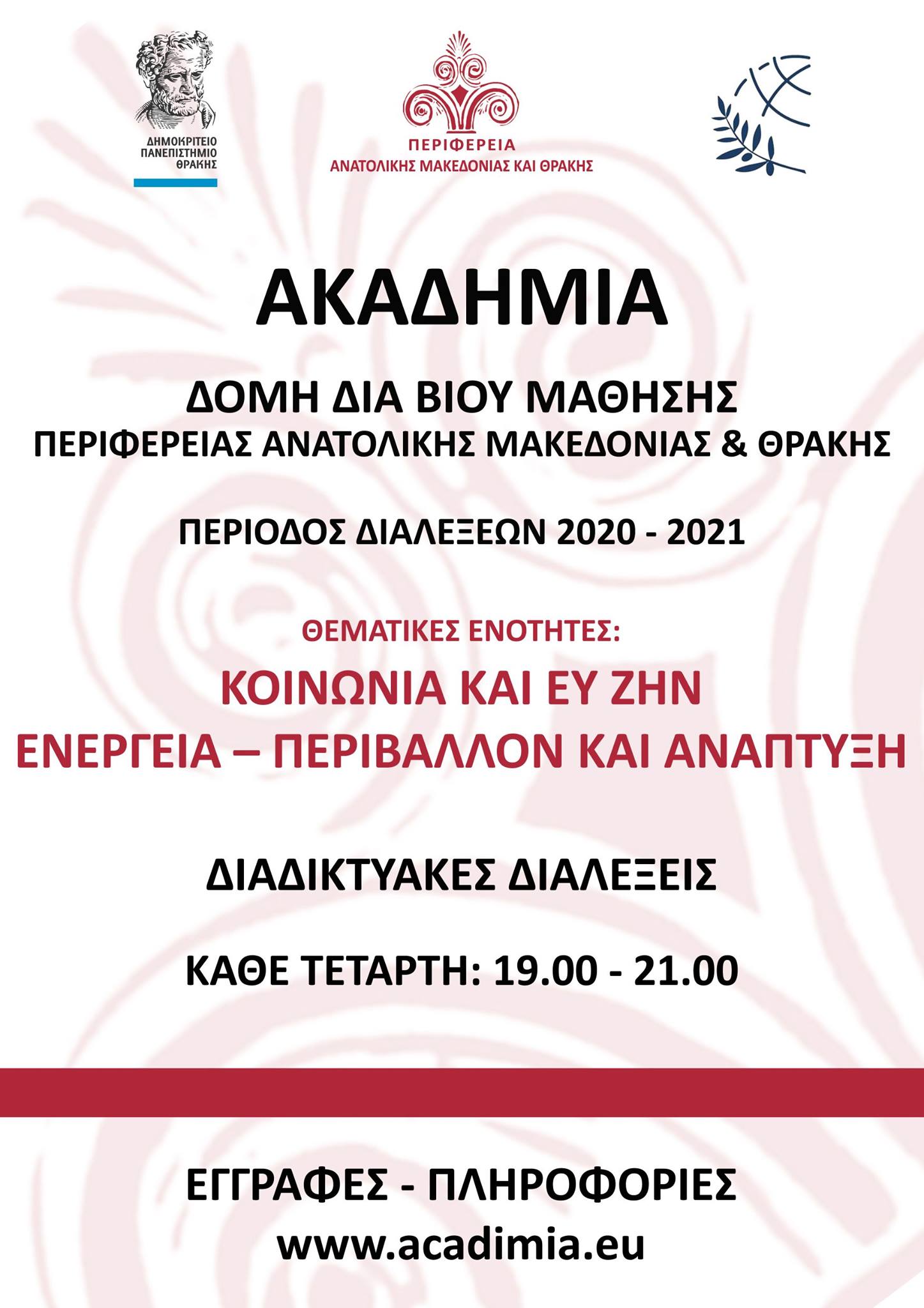 Η θεματολογία των διαλέξεων που παρουσιάζονται διαδικτυακά αυτήν την Τετάρτη, 3 Φεβρουαρίου 2021, στην ΑΚΑΔΗΜΙΑ – Δομή Δια Βίου Μάθησης Περιφέρειας Ανατολικής Μακεδονίας και Θράκης, έχει ως εξής: