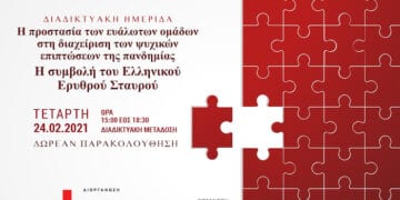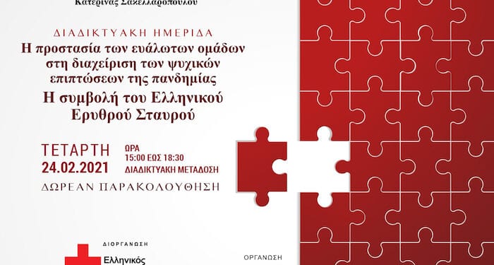Υπό την αιγίδα της Προέδρου της Δημοκρατίας Κατερίνας Σακελλαροπούλου, ο Τομέας Κοινωνικής Πρόνοιας του Ελληνικού Ερυθρού Σταυρού σάς προσκαλεί σε Διαδικτυακή Ημερίδα, με θέμα: «Η προστασία των ευάλωτων ομάδων στη διαχείριση των ψυχικών επιπτώσεων της πανδημίας – Η συμβολή του Ελληνικού Ερυθρού Σταυρού»