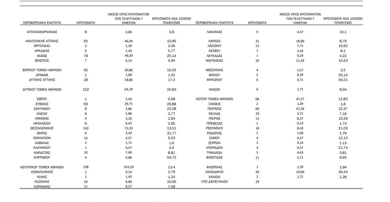 558 κρούσματα η Αττική που συνεχίζει να επιβαρύνεται η επιδημιολογική της εικόνα, ενώ στα 150 τα κρούσματα της Θεσσαλονίκης, σημειώνοντας μικρή άνοδο. 78 τα κρούσματα στην Αχαία και 63 στην Εύβοια.