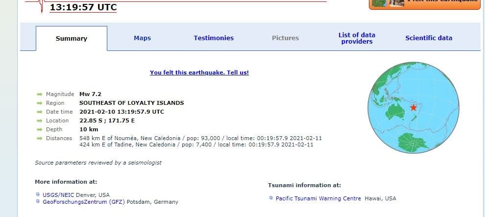 Η δόνηση σημειώθηκε σε θαλάσσιο χώρο, με εστιακό βάθος 10 χλμ. και επίκεντρο στα 424 χλμ. ανατολικά της πόλης Tadine στη Νέα Καληδονία (βρίσκεται στο πέλαγος της Μελανησίας, βορειανατολικά από την Αυστραλία).