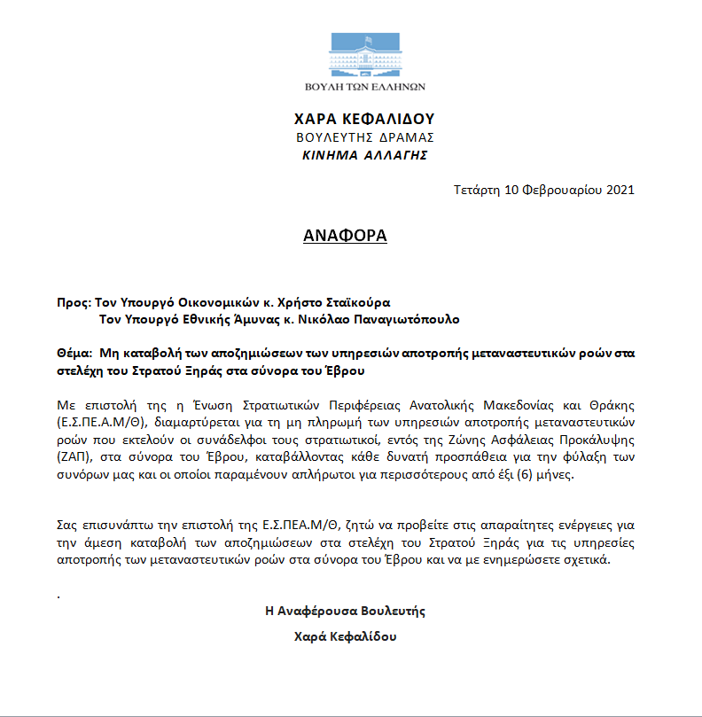 για τη μη πληρωμή των υπηρεσιών αποτροπής μεταναστευτικών ροών που εκτελούν οι συνάδελφοι μας στρατιωτικοί του Στρατού Ξηράς, εντός της Ζώνης Ασφάλειας Προκάλυψης (ΖΑΠ) στα σύνορα του Έβρου, καταβάλλοντας κάθε δυνατή προσπάθεια για την φύλαξη των συνόρων μας και οι οποίοι παραμένουν απλήρωτοι για περισσότερους από έξι (6) μήνες. Η κυρία Κεφαλίδου ζητά από τον Υπουργό να προβεί στις απαραίτητες ενέργειες για την άμεση καταβολή των αποζημιώσεων στα στελέχη του Στρατού Ξηράς για τις υπηρεσίες αποτροπής των μεταναστευτικών ροών στα σύνορα του Έβρου.