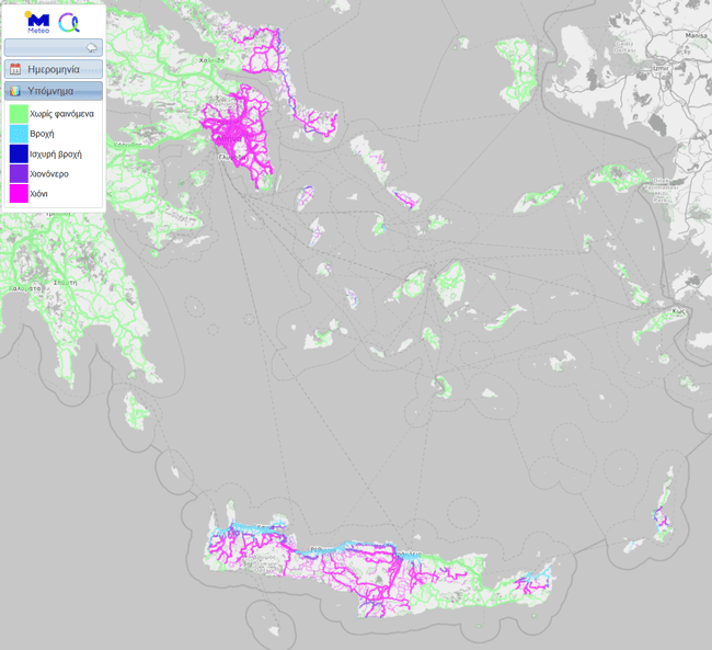 Λόγω των δυσμενών συνθηκών που θα επικρατήσουν στο οδικό δίκτυο της Ανατολικής Στερεάς και της Κρήτης κατά τη διάρκεια της νύχτας της Δευτέρας 15/2 προς Τρίτη 16/2 σας προτρέπουμε να χρησιμοποιείτε την υπηρεσία μας «ΣΥΝΘΗΚΕΣ ΟΔΙΚΟΥ ΔΙΚΤΥΟΥ» για τον προγραμματισμό των οδικών σας μετακινήσεων. Στο χάρτη που ακολουθεί παρουσιάζονται οι συνθήκες που αναμένεται να επικρατήσουν το πρωί της Τρίτης 16/2. Με μωβ αποχρώσεις φαίνονται τα τμήματα του δικτύου όπου αναμένονται χιονοπτώσεις ή χιονόνερο.
