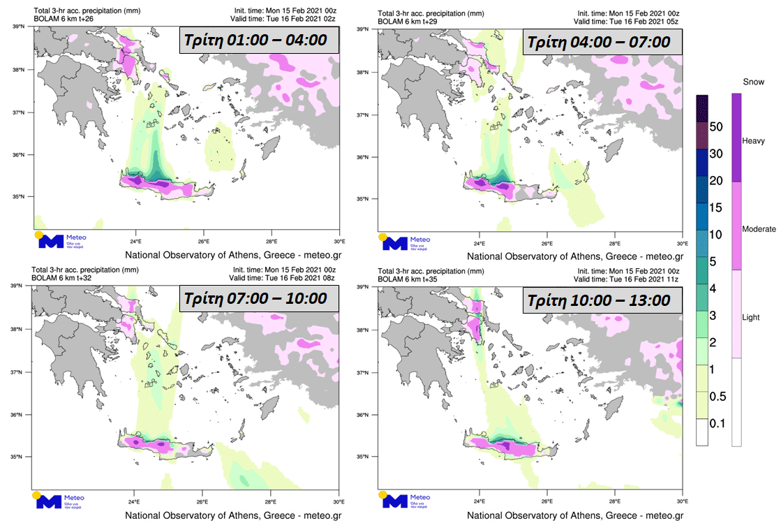 Βροχές ή χιονόνερο αναμένονται στις Σποράδες, στα νησιά του Κεντρικού και Νοτίου Αιγαίου καθώς και στις παράκτιες περιοχές της Κρήτης. Στους χάρτες που ακολουθούν παρουσιάζεται ο ολικός υετός (βροχή/χιονόνερο/χιόνι) που αναμένεται από τις πρώτες ώρες έως το μεσημέρι της Τρίτης 16/2 σύμφωνα με το μοντέλο πρόγνωσης υψηλής ανάλυσης του Εθνικού Αστεροσκοπείου Αθηνών/meteo.gr. Με μπλε αποχρώσεις φαίνεται η βροχή/χιονόνερο και με μωβ αποχρώσεις η ένταση των χιονοπτώσεων.
