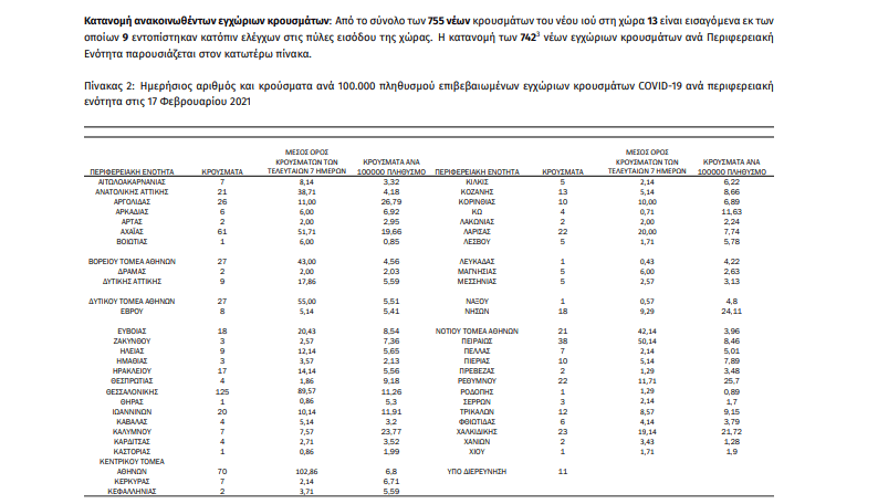Τα στοιχεία που παρουσιάζονται αφορούν περιστατικά από την επιδημιολογική επιτήρηση της νόσου από το νέο κορωνοϊό (COVID19), με βάση τα δεδομένα που έχουν δηλωθεί στον ΕΟΔΥ και καταγραφεί μέχρι τις 17 Φεβρουαρίου 2021 (ώρα 15:00).