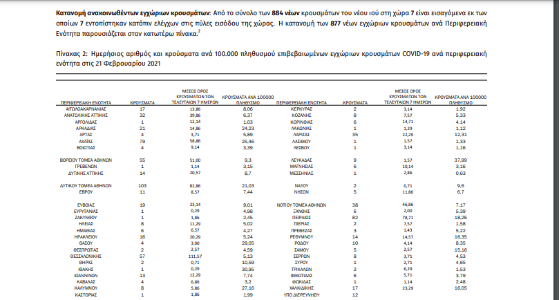 Με βάση τα επιβεβαιωμένα κρούσματα των τελευταίων 7 ημερών, 46 θεωρούνται σχετιζόμενα με ταξίδι από το εξωτερικό και 2.417 είναι σχετιζόμενα με ήδη γνωστό κρούσμα.