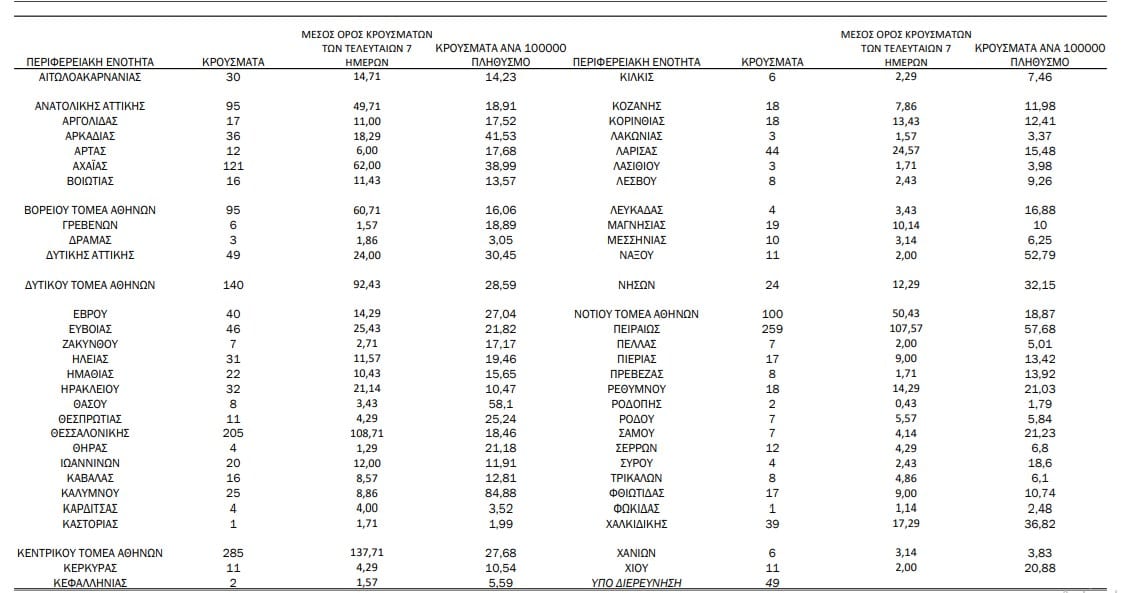 Προβληματική παραμένει η κατάσταση σε Αχαΐα και Θεσσαλονίκη, όπου καταγράφηκαν 125 και 205 νέες μολύνσεις αντίστοιχα. Επίσης υψηλά νούμερα καταγράφηκαν σε Εύβοια (46), Κάλυμνο (20), Χαλκιδική (39), Έβρο (40), Αρκαδία (36), Ηλεία (31), Ηράκλειο (32) και Λάρισα (44).