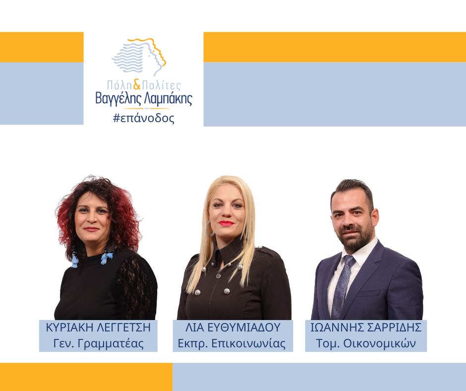 Τρεις νέοι και δραστήριοι άνθρωποι, καταξιωμένοι επαγγελματίες, γνωστά και αγαπητά μέλη της τοπικής μας κοινωνίας , αναλαμβάνουν την ευθύνη της διαχείρισης των δράσεων σε τρεις νευραλγικούς τομείς αναφορικά με τη λειτουργία της παράταξης.