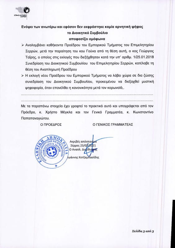 Γνωρίζοντας ότι έχει λήξει η θητεία της παρούσας διοίκησης, αλλά και ότι αρκετά μέλη της διοίκησης είτε έχουν συνταξιοδοτηθεί είτε έχουν αλλάξει επαγγελματική δραστηριότητα σας γνωστοποιούμε το ενδιαφέρον μας και σας ζητούμε να προβείτε σε όλες τις νόμιμες διαδικασίες έτσι ώστε σε σύντομο χρονικό διάστημα να οδηγήσετε σε εκλογές τον εμπορικό σύλλογο Σερρών.