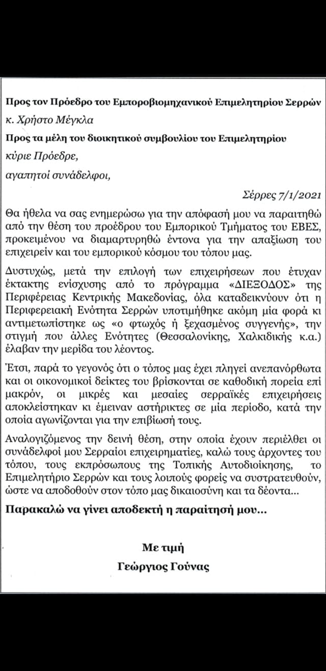 Η παραίτηση του κ.Γούνα έγινε δεκτή από την διοίκηση του ΕΒΕΣ όπως φαίνεται και στην σελίδα του Επιμελητηρίου Σερρών.