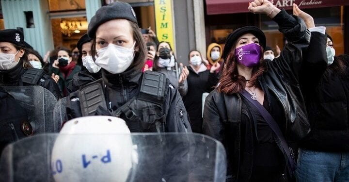 Οι διαδηλωτές στην Κωνσταντινούπολη φώναζαν συνθήματα όπως «Η γυναικοκτονία είναι πολιτική πράξη» και «Η ζωή είναι δική μας, η επιλογή είναι δική μας, οι δρόμοι είναι δικοί μας, κρατήστε την οικογένειά σας».