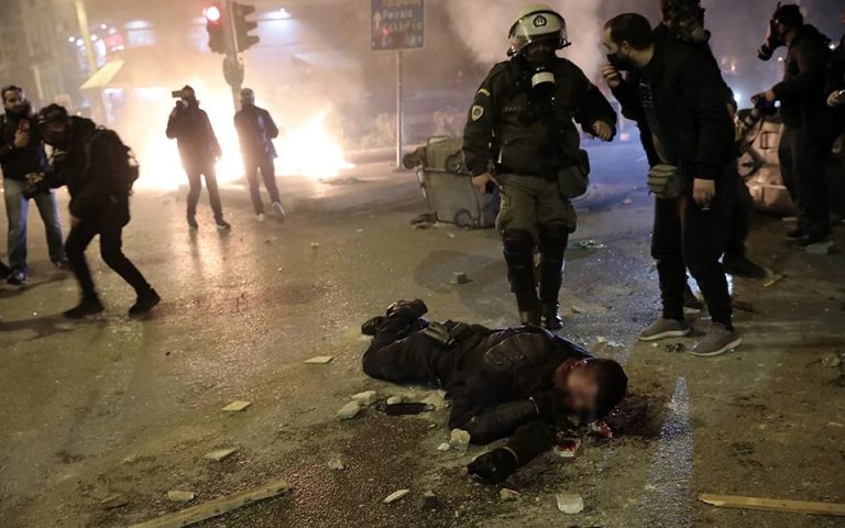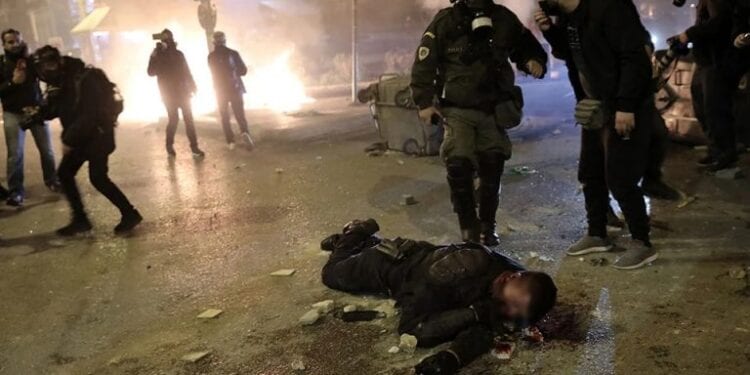 Ένας αστυνομικός τραυμαστίστηκε σοβαρά όταν διαδηλωτές- μπαχαλάκηδες τον έριξαν από την μοτοσυκλέτα που επέβαινε και δεκάδες τον λυντσάρισαν κυριολεκτικά, αφήνοντας τον αιμόφυτρτο στη μέση του δρόμου. Άνδρες της αστυνομίας επενέβησαν σωτήρια και σχημάτισαν κύκλο γύρω του για να τον προστατεύσουν, ενώ επί τόπου έφτασε ασθενοφόρο του ΕΚΑΒ που τον μετέφερε σε νοσοκομείο.
