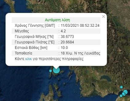 Σεισμική δόνηση 4,2 Ρίχτερ, σύμφωνα με την αυτόματη λύση του Γεωδυναμικού Ινστιτούτου του Εθνικού Αστεροσκοπείου Αθηνών, σημειώθηκε στις 10:52 στη Λευκάδα.