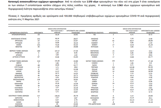 Σύμφωνα με τον ΕΟΔΥ, τα νέα εργαστηριακά επιβεβαιωμένα κρούσματα της νόσου που καταγράφηκαν τις τελευταίες 24 ώρες είναι 2.570, εκ των οποίων 7 εντοπίστηκαν κατόπιν ελέγχων στις πύλες εισόδου της χώρας. Ο συνολικός αριθμός των κρουσμάτων ανέρχεται σε 214.661 (ημερήσια μεταβολή +1.2%), εκ των οποίων 51.6% άνδρες. Με βάση τα επιβεβαιωμένα κρούσματα των τελευταίων 7 ημερών, 65 θεωρούνται σχετιζόμενα με ταξίδι από το εξωτερικό και 1.843 είναι σχετιζόμενα με ήδη γνωστό κρούσμα.