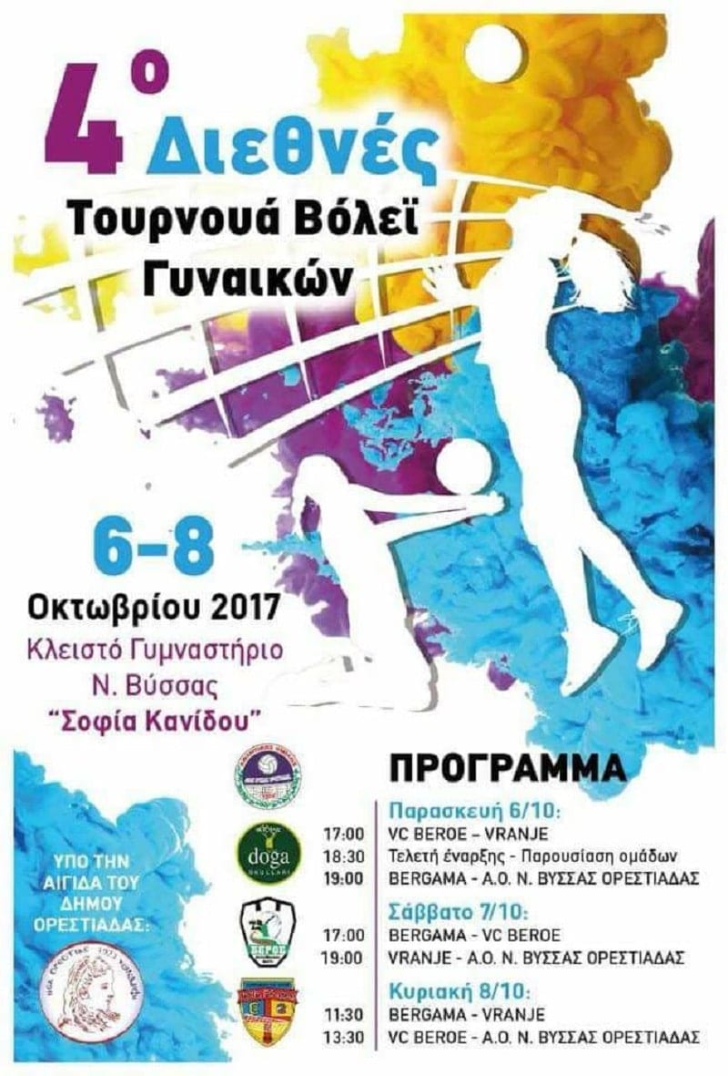O Α.Ο. Νέας Βύσσας Ορεστιάδας και ο Δήμος Ορεστιάδας διοργανώνουν το τριήμερο 6-8 Οκτωβρίου το 4o Διαβαλκανικό Τουρνουά Βόλεϊ Γυναικών. Στο τουρνουά θα πάρουν μέρος τέσσερις ομάδες. Εκτός από την διοργανώτρια ομάδα του Α.Ο. Νέας Βύσσας Ορεστιάδας θα συμμετέχει επίσης η Βουλγαρική vc Boroe, η Σέρβικη Vranje, και η Τούρκικη Bergama. Όλοι οι αγώνες θα διεξαχθούν στο Κλειστό Γυμναστήριο Νέας Βύσσας «Σοφία Κανίδου».