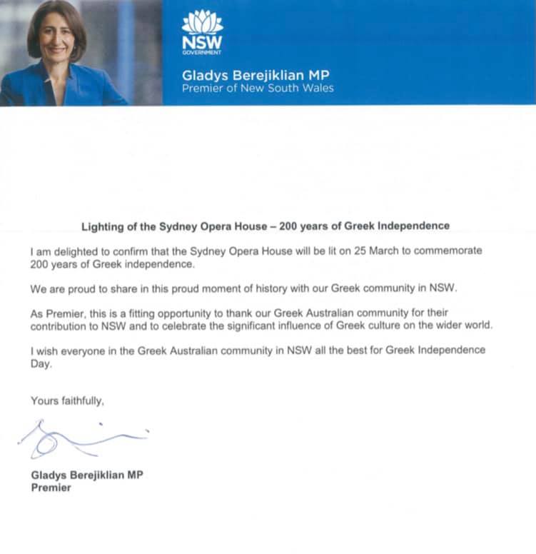 Με εντυπωσιακό τρόπο αποφάσισε να τιμήσει την επέτειο της έναρξης της Ελληνικής Επανάστασης του 1821 η πρωθυπουργός της Νέας Νότιας Ουαλίας Gladys Berejiklian